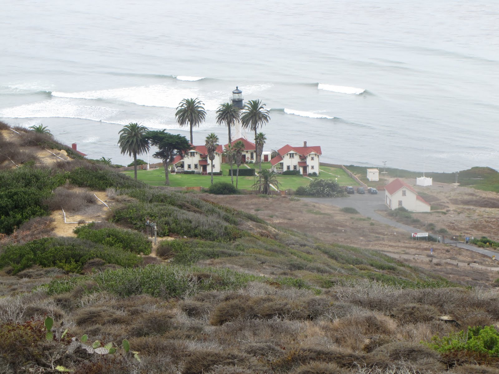 Jedenfalls habe ich noch versucht, das beste aus den beiden letzten Tagen in "America's finest City" zu machen und bin am Sonnabend Morgen noch einmal nach La Jolla gefahren um zu boarden. Die haben ja eine reizvolle Steilküste da, die hat nur den Nachteil, dass man da erst einmal runter und auch wieder rauf muss. Ich habe bei einem kleinen Pfad, wo die ganzen Surfer runter sind, mein Auto geparkt. Ich hatte noch einen gefragt, der gerade wieder hochgelaufen kam, ob es denn weit bis zu Strand sei. So 10 Minuten, meinte er, was vielleicht auch stimmte, aber als Ungeübter ein ausgetrocknetes Bachbett inklusive Kletterpassagen über Holzbalken herunterzuklettern (mit Board und zwei Taschen wohlgemerkt) muss ich auch noch nicht noch einmal haben. Ich habe mal ein Foto vom Strand aus gemacht, was vielleicht einen kleinen Eindruck gibt: